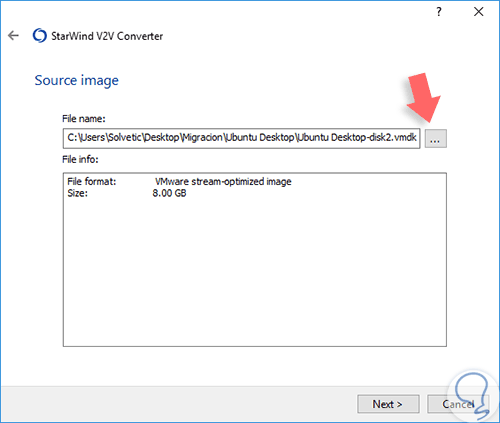 Pulsamos en Next y en la ventana desplegada debemos seleccionar la imagen de disco virtual que hemos descomprimido anteriormente.