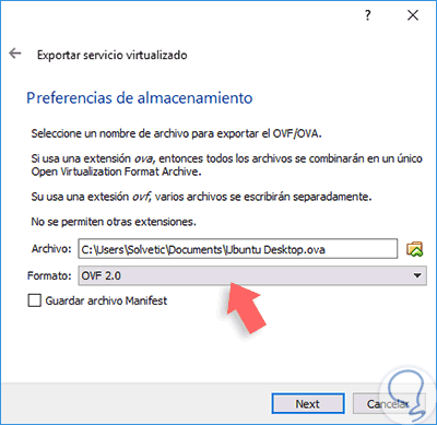 Pulsamos en Next y en la ventana desplegada definimos la ruta donde se ha de almacenar la máquina virtual y debemos asegurarnos que el tipo de archivo sea OVF 2.0.