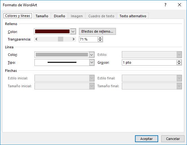 Se desplegará la siguiente ventana donde definiremos el nivel de transparencia del WordArt. Pulsamos en