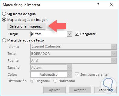 Veremos la siguiente ventana donde nos dirigimos a la pestaña "Imagen" y en el campo "Color" seleccionamos la opción "Marca de agua". Pulsamos "Aceptar":