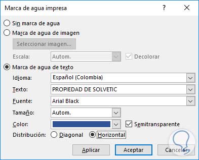 Para este ejemplo agregaremos un texto personalizado, por lo tanto seleccionamos la opción Marca de agua de texto e ingresamos el texto a desplegar, el tipo de fuente a usar, el color y la forma como será distribuido el texto (Horizontal o Vertical). Pulsamos en "Aplicar".