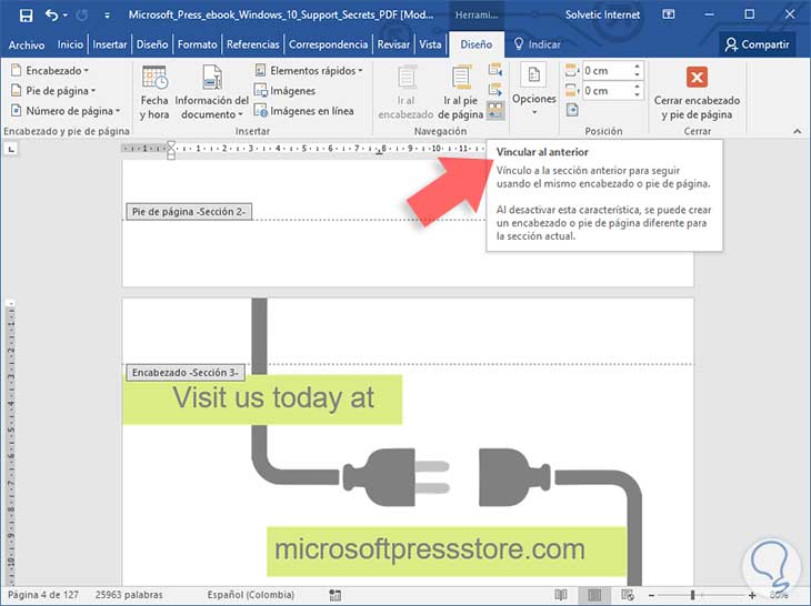 Podemos ver que se ha activado una nueva sección llamada "Herramientas de encabezado y pie de página", allí vamos a la pestaña "Diseño" y damos clic sobre la opción "Vincular al anterior".