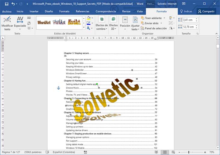 Si deseamos desde el menú "Formato" podemos cambiar la apariencia de nuestro WordArt. De esta forma hemos establecido una marca de agua en una sola página de Word 2016. De la misma forma podemos agregar una imagen y convertirla en una marca de agua en Word 2016.
