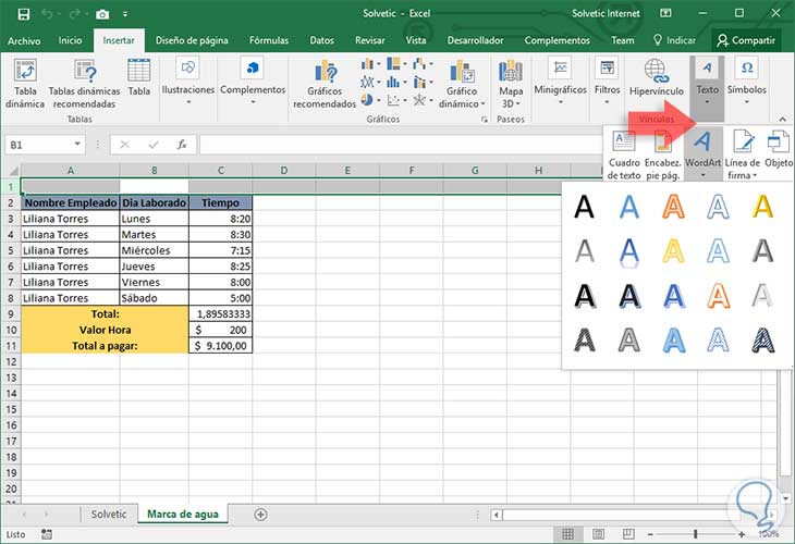 WordArt es una opción viable si deseamos agregar una marca de agua en Excel 2016. Para esto vamos a la ficha "Insertar" y seleccionamos la opción "WordArt" del grupo "Texto". Seleccionamos el diseño que más se ajuste a la necesidad y editamos el texto según el requerimiento.