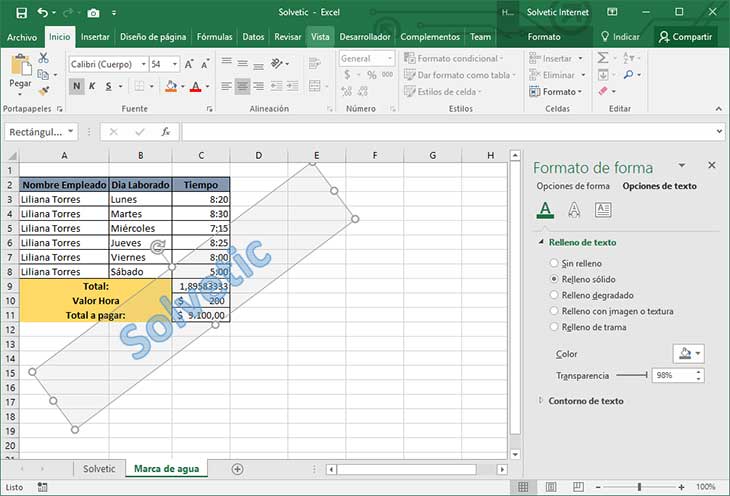 Ajustamos la orientación del WordArt y damos clic derecho sobre el para seleccionar la opción "Formato de forma" y veremos las siguientes opciones en el costado derecho donde debemos seleccionar la opción "Relleno de texto" y a continuación seleccionamos "Relleno sólido" y determinar el nivel de transparencia del mismo.