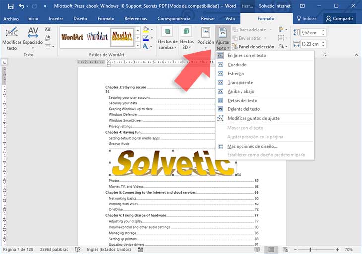 Ahora vamos al menú de WordArt y seleccionamos la opción "Ajustar texto" ubicada en el grupo "Organizar" y veremos las siguientes opciones. Allí seleccionamos la opción "Detrás del texto".
