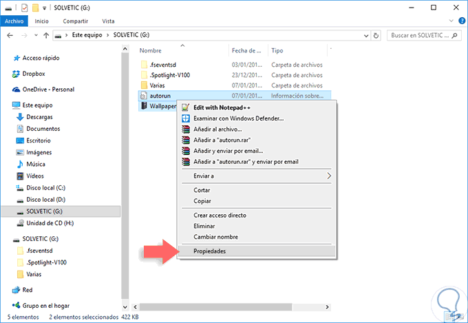 Ahora seleccionamos tanto el archivo .ico y el archivo autorun.inf y damos clic derecho / Propiedades.