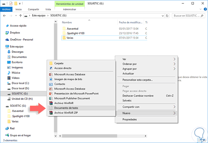 Conectamos el medio extraíble (USB o Disco Duro) sobre el cual deseamos modificar su apariencia. A través del Explorador de archivos accedemos al dispositivo mencionado y será necesario crear un documento de texto y para ello daremos clic derecho y seleccionamos la opción Nuevo / Documento de texto. Guardamos el nombre del archivo como autorun.inf.