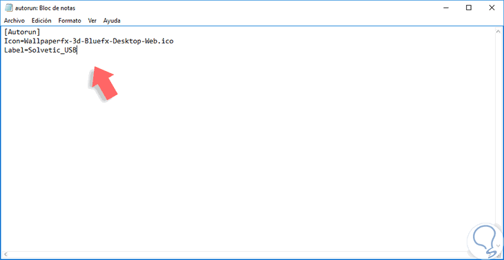 Ahora pulsamos doble clic sobre el archivo autorun.inf y en el archivo de texto desplegado debemos ingresar la siguiente sintaxis: