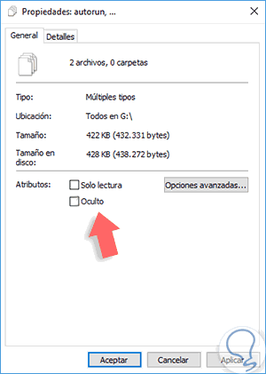 Para esto basta con acceder nuevamente a las propiedades de los archivos y desmarcar la casilla Oculto y proceder a borrar los respectivos archivos.