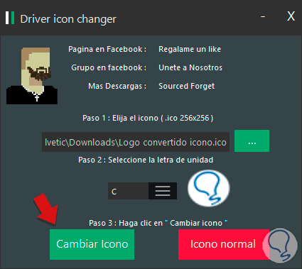 Ahora abrimos el programa Drive Icon Changer en el cual podemos elegir el icono que queremos colocar y que hemos creado y la letra de la unidad del disco. Una vez hayas elegido ambas cosas pulsa en “Cambiar icono”.