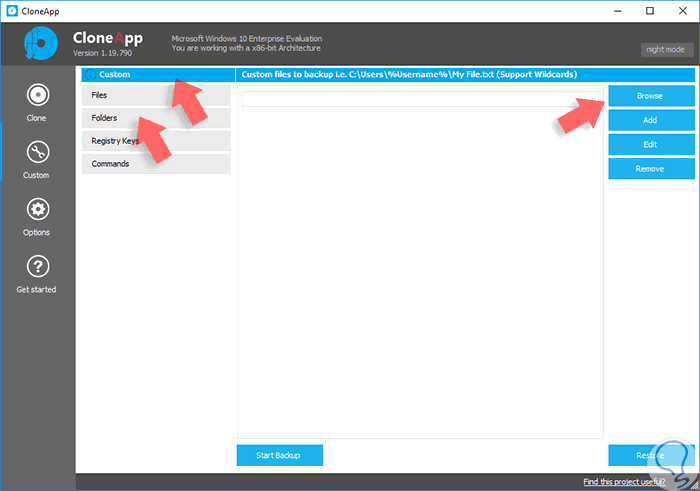 Pulsamos en la ficha Custom y veremos la siguiente ventana. Allí podemos seleccionar archivos, carpetas, registros, etc.