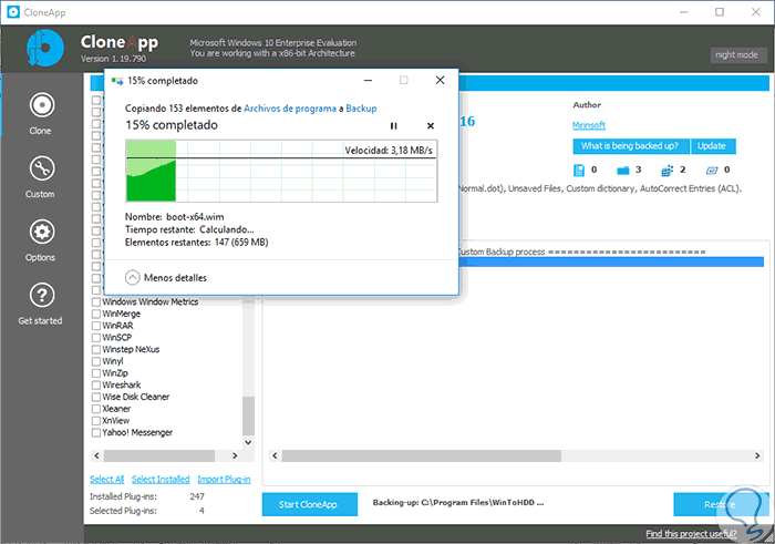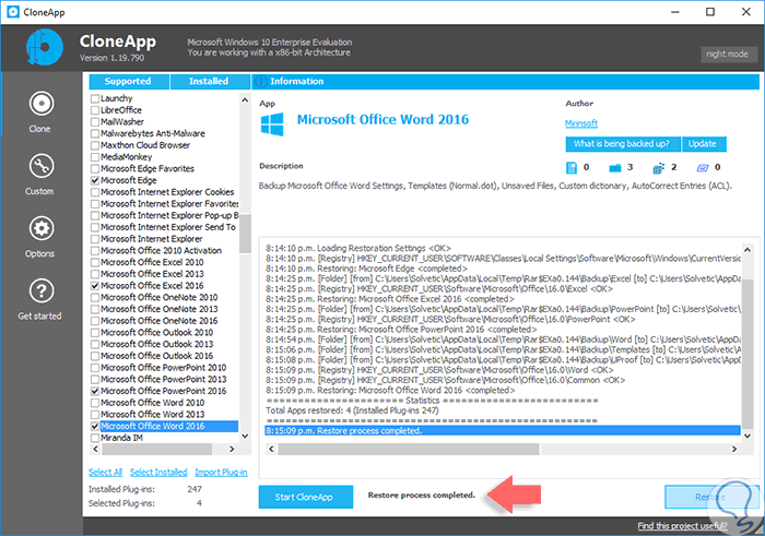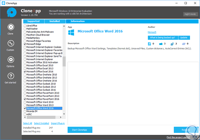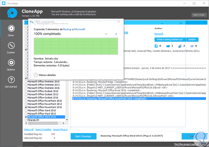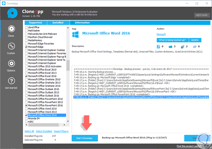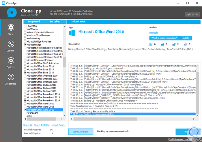Podemos ver en el costado derecho que se despliegan los tipos de programa a respaldar, por ejemplo, en este caso elegimos Microsoft Office Word 2016 y se indica el nombre de la App, el autor y la categoría donde pertenece (Folder - Carpeta). Una vez definamos que programas respaldar debemos dar clic en el botón Start CloneApp ubicado en la parte inferior y podemos ver que inicia el proceso de respaldo.