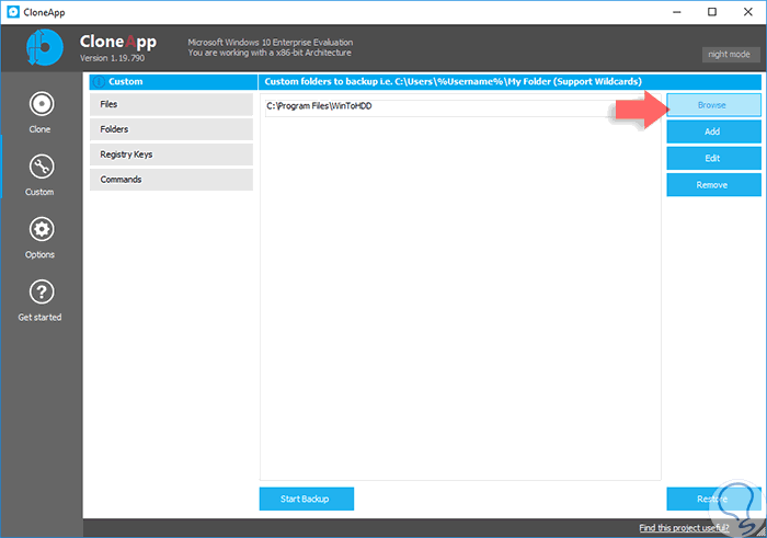 - La ruta donde se almacenarán las copias de seguridad, observemos que de forma predeterminada CloneApp ha creado una carpeta llamada Backup en el mismo directorio donde ha sido instalada la herramienta. SI deseamos modificar esta ruta debemos usar el botón Browse e indicar la nueva ruta pero lo recomendable es dejar la ruta por defecto.