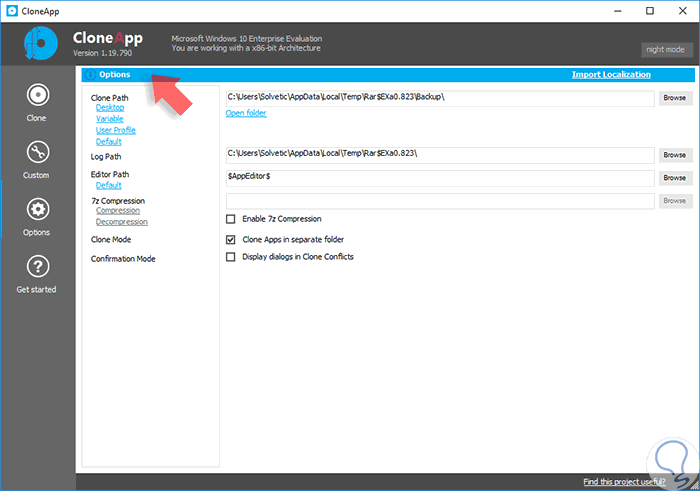 Podemos detallar el mensaje informativo en la parte inferior de la herramienta. Notamos que CloneApp detecta la versión de sistema operativo actual así como la arquitectura del equipo (Parte superior). Antes de iniciar el proceso de respaldo de los programas debemos verificar que los ajustes de la herramienta estén alineados con los valores que buscamos. Para verificar esto pulsamos en la ficha Options y veremos lo siguiente: