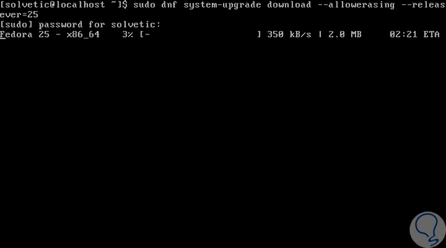 El siguiente paso consiste en descargar los paquetes de actualización de Fedora 25, para ello ejecutamos el siguiente comando: