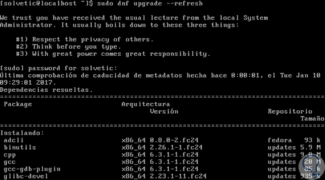 Una vez respaldada la información procedemos a actualizar los paquetes del sistema operativo Fedora 24 usando el siguiente comando: