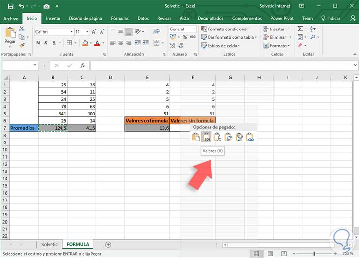 Como vemos se ha pegado el valor de la celda seleccionada (B7) sin ninguna fórmula, de modo que cuando editemos alguno de los valores del rango F1:F5 no se verá afectado el resultado de la celda F7. Tenemos estas opciones para pegar únicamente valores en Excel 2016 sin que la fórmula usada sea incluida en el proceso de pegado.