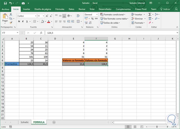 Veremos que se han pegado los valores incluida la formula PROMEDIO, de modo que si editamos algún valor del rango E1:E5 se actualizare el valor en la celda E7.