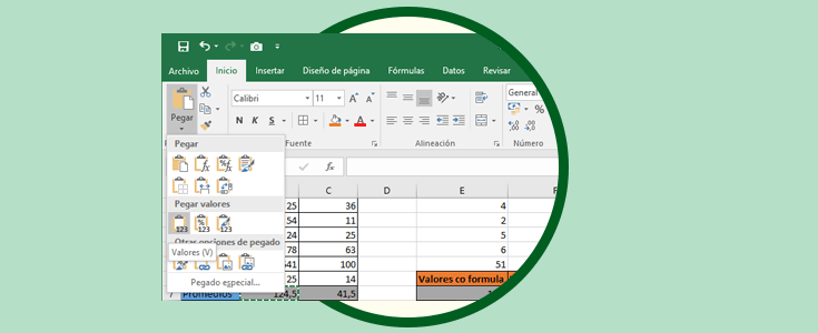 Ahora vamos a la celda donde deseamos pegar dichos valores, en este caso la celda E7, y usamos alguna de las siguientes opciones para pegar los valores: