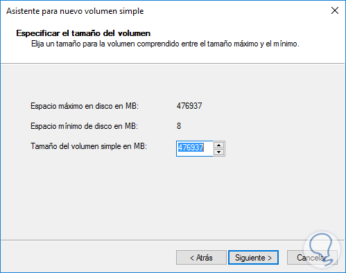 Pulsamos en Siguiente en el asistente que se habrá desplegado y a continuación definimos la cantidad de espacio que será asignada a dicho volumen, en este caso dejamos la totalidad del espacio.
