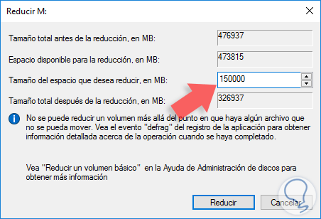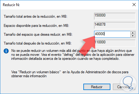 Se desplegará el siguiente asistente donde debemos definir la cantidad de espacio que será asignada a la nueva partición. Pulsamos en el botón Reducir para iniciar el proceso de reducción y creación de la partición.