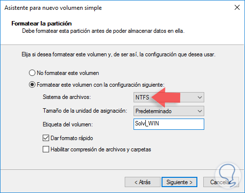 Al pulsar Siguiente debemos realizar el formato del nuevo volumen cuidando que el sistema de archivos sea NTFS: