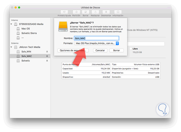 Seleccionaremos la partición asignada a macOS Sierra, Solv_MAC, y pulsamos sobre el botón Borrar ubicado en la parte superior y en la ventana desplegada elegimos el Formato Mac OS Plus Extended o Mac OS Plus (mayus/minus, con reg)