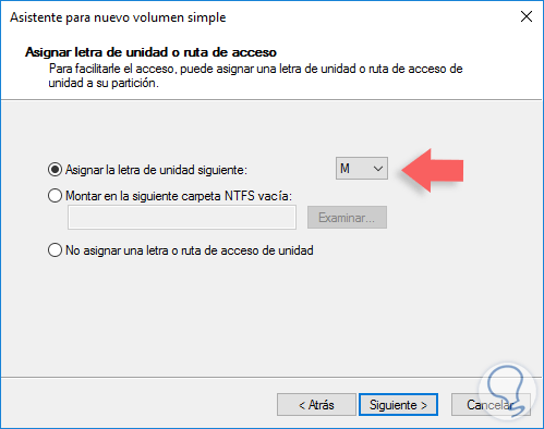 Pulsamos nuevamente Siguiente y en la ventana desplegada asignaremos la letra de la unidad para el nuevo volumen.