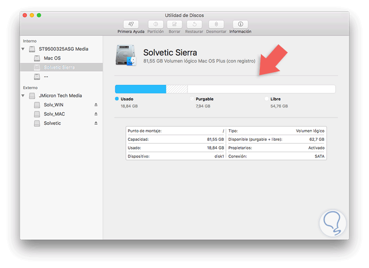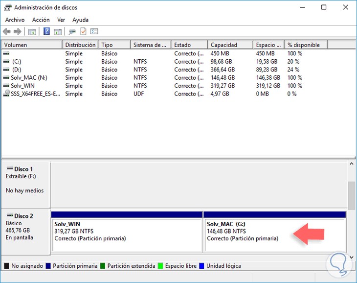 Hasta este punto hemos creado las particiones para Windows 10 (Solv_WIN) y para macOS Sierra (Solv_MAC).