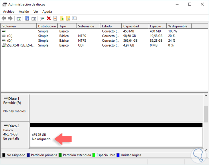 Allí podemos ver nuestro disco externo conectado, en este caso el Disco 2, cuya leyenda es No asignado. Daremos clic derecho sobre el disco y seleccionamos la opción Nuevo volumen simple.