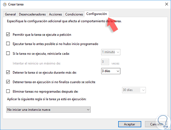 Finalmente, en la pestaña Configuración podemos definir valores adicionales que serán aplicados a la tarea si se cumplen una serie de condiciones.