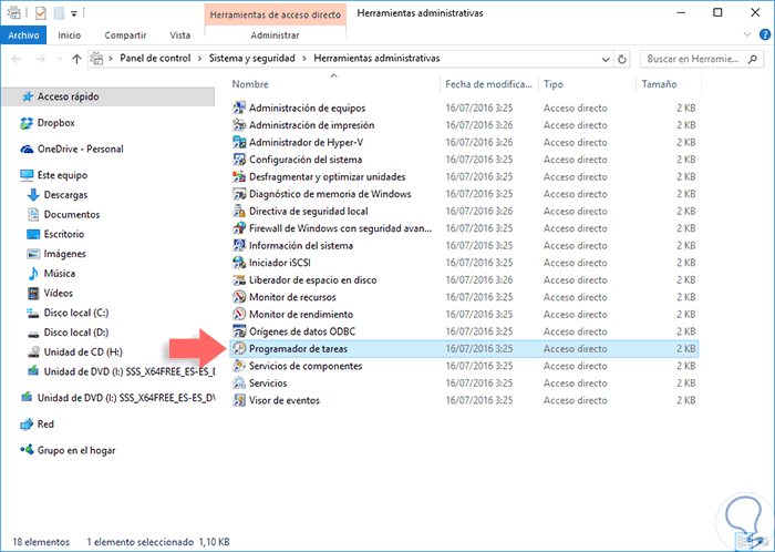 Allí podemos seleccionar la opción Programar tareas o bien dar clic sobre Herramientas administrativas y se abrirá la siguiente ventana donde seleccionamos la opción Programador de tareas.