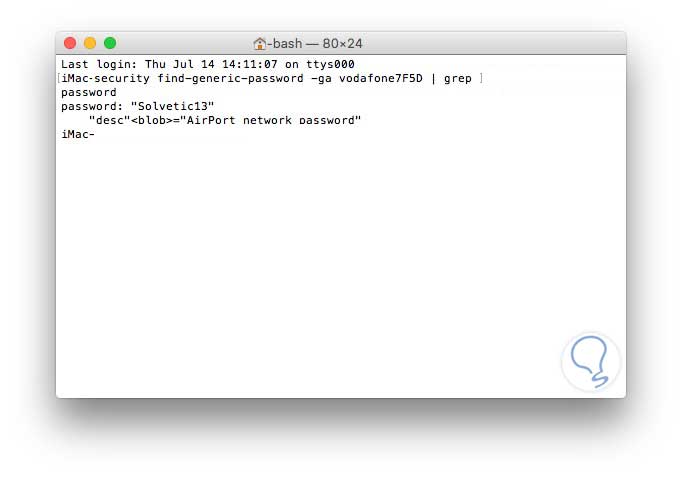 security find-generic-password -ga vodafone7F5D | grep passwordUna vez que hayamos realizado esto, podremos ver como aparece una ventana emergente en la que debemos introducir nuestros usuario y contraseña de Mac.