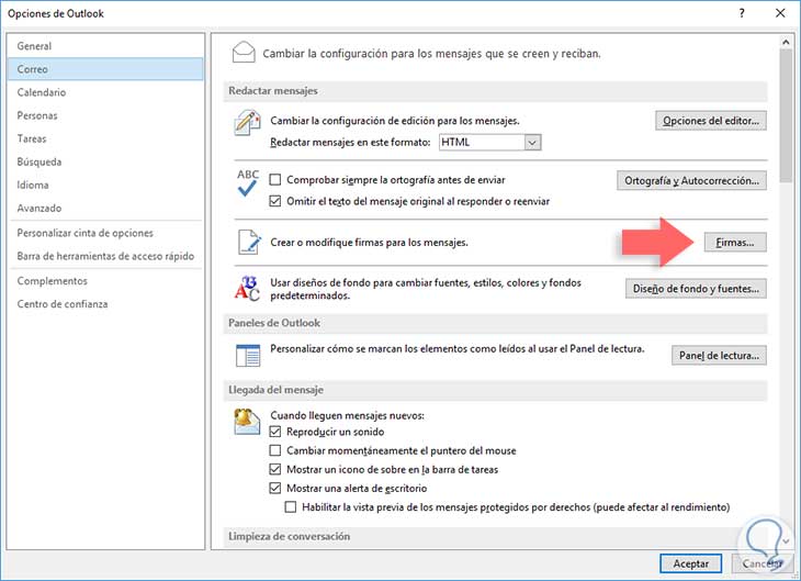 En la ventana desplegada vamos a la ficha Correo y en el panel central pulsamos sobre el botón Firmas ubicado en el campo Cree o modificar firmas paras los mensajes