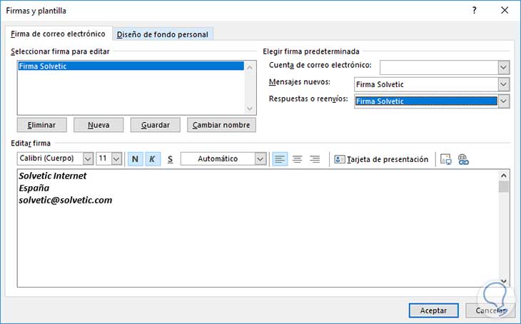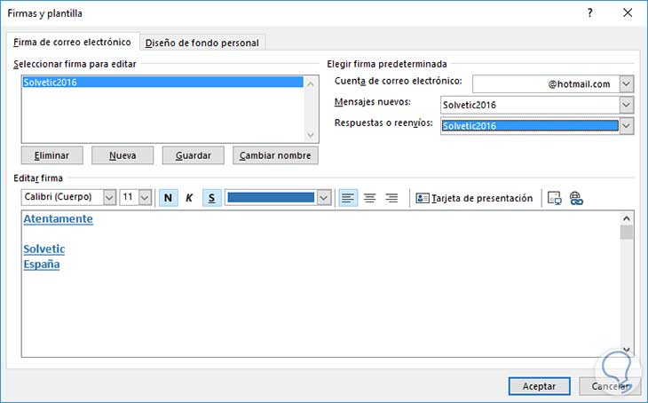 Pulsamos en Aceptar y a continuación será necesario establecer la firma según nuestro gusto: