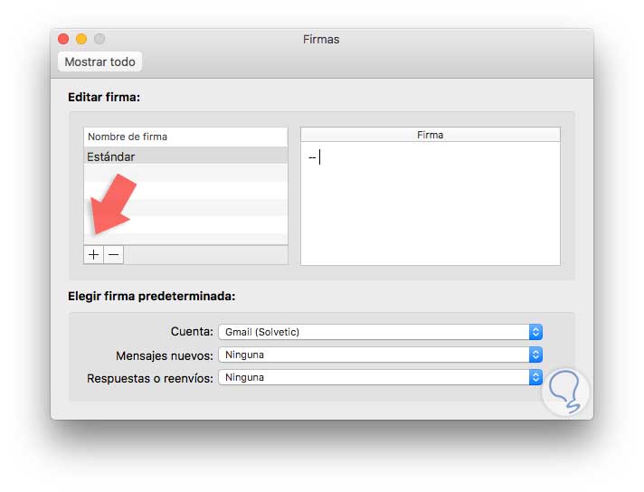 Se abrirá la siguiente ventana donde daremos clic sobre el signo + para crear nuestra firma para los mensajes de correo: