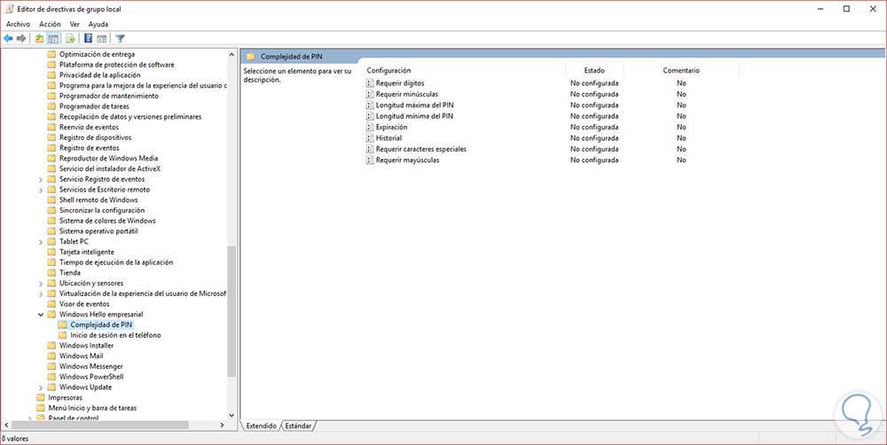 Configuración del equipo / Plantillas administrativas / Componentes de Windows / Windows Hello Empresarial / Complejidad de PIN