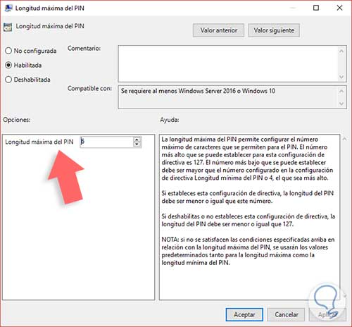 Como vemos desde esta opción podemos ajustar diversos valores para que el PIN aparte de seguro, sea complejo y no cualquiera tenga acceso al sistema. Para editar alguna de estas políticas basta dar doble clic sobre ella, activar la casilla Habilitada y ajustar los parámetros según la necesidad requerida: Por ejemplo, podemos definir el tamaño máximo del PIN: