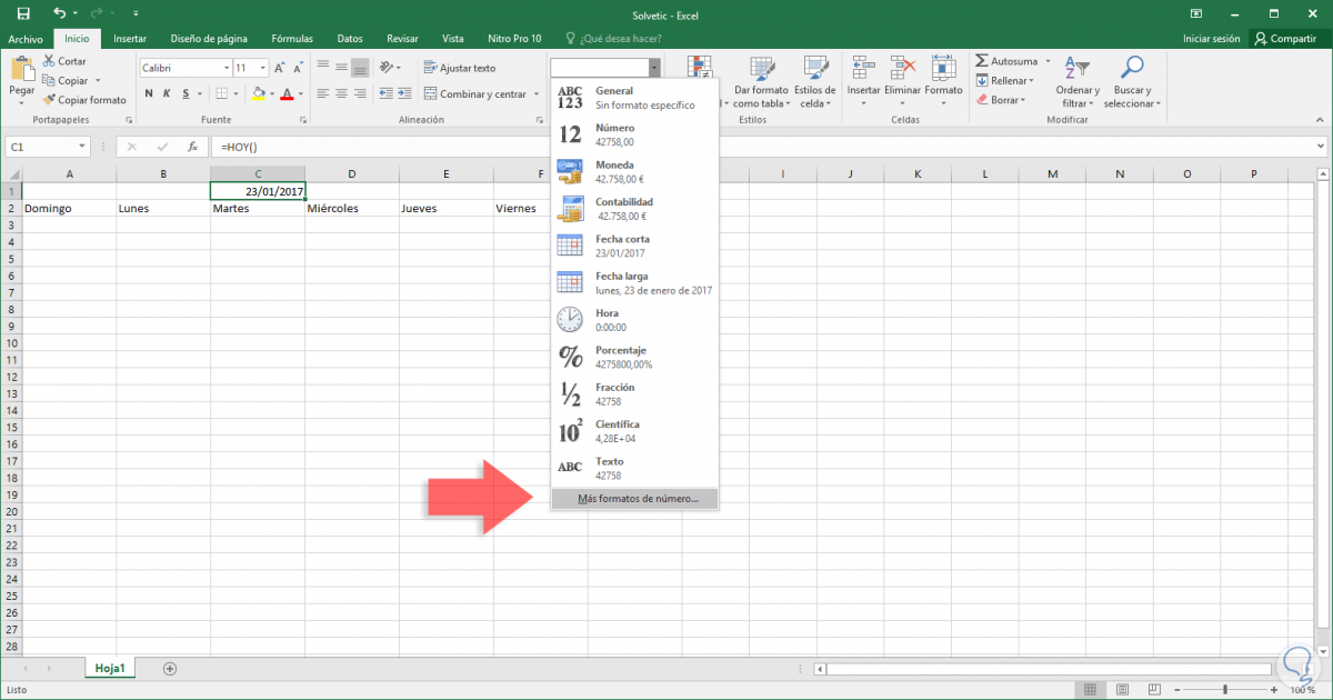 Aunque este es el resultado valido por la fórmula =HOY() no es lo que deseamos este desplegado en la primer fila de nuestro calendario, por ello será necesario editarlo y para esto seleccionamos la celda donde hemos incluido la formula y vamos a la ficha Inicio, grupo Número y desplegamos las opciones del campo Fecha y seleccionamos Mas formatos de numero