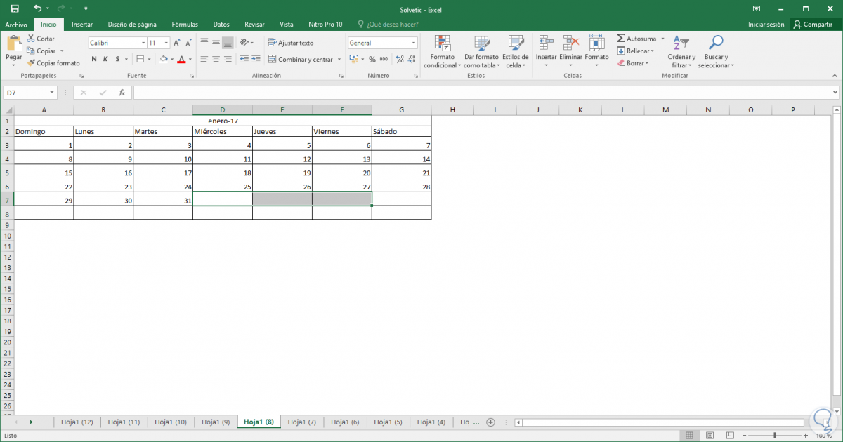 Este proceso lo repetimos 12 veces correspondiente a los 12 meses del año Allí simplemente será cuestión de ir a cada hoja y editar el mes y los respectivos días.