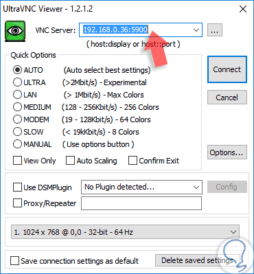 Para este ejemplo usaremos UltraVNC. Abrimos la aplicación y será necesario ingresar la dirección IP seguida del puerto 5900 el cual es el puerto usado para la comunicación.