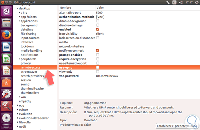 En primer lugar, configuramos los parámetros ya indicados en la opción Preferencias de compartición de escritorio. También debemos instalar una herramienta llamada dconf-editor usando el siguiente comando: