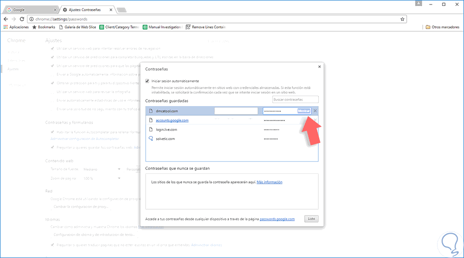 Allí simplemente seleccionamos la contraseña deseada y pulsamos en el botón Mostrar. De este modo veremos la respectiva contraseña almacenada en Google Chrome.
