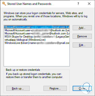 Una vez ejecutado podrás ver una ventana emergente donde verás los diferentes usuarios y contraseñas de credenciales almacenados en Windows 10. Pulsa sobre cada uno para ver credenciales Windows 10.