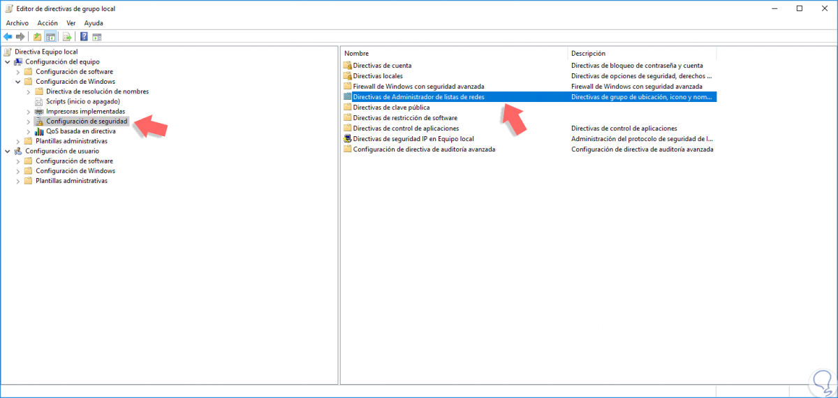 • Configuración de seguridad y seleccionaremos la política llamada Directivas de administrador de listas de redes.