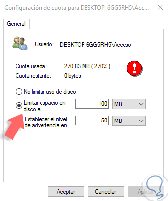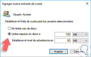 - Definir el tamaño a asignar de cuota al usuario ya sea en KB, MB, GB, etc.