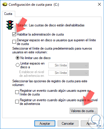 Allí será necesario activar la casilla Habilitar la administración de cuota para que tengamos la posibilidad de gestionar todos los parámetros de la cuota del disco duro.