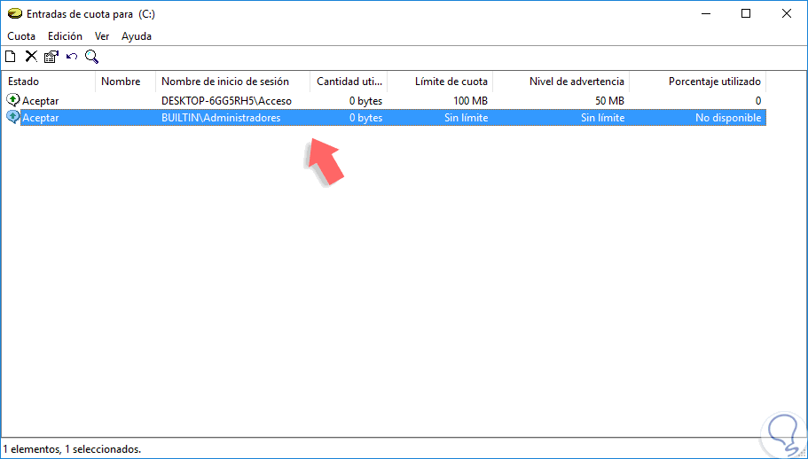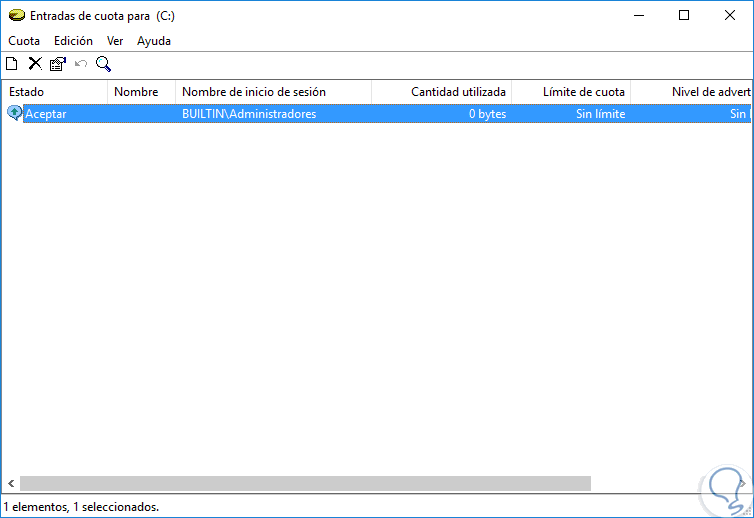 De esta forma ya hemos establecido un nivel de cuota para el disco y podremos hacer un control sobre el uso dado al espacio en el disco duro por parte de los usuarios.