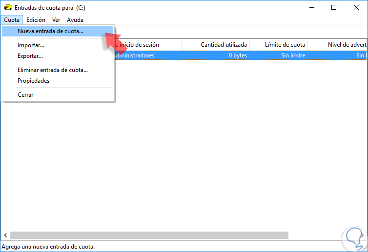 Podemos ver que esta es la cuota por defecto del disco, para adicionar nuestra cuota personalizada vamos al menú Cuota y allí seleccionamos la opción Nueva entrada de cuota.